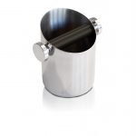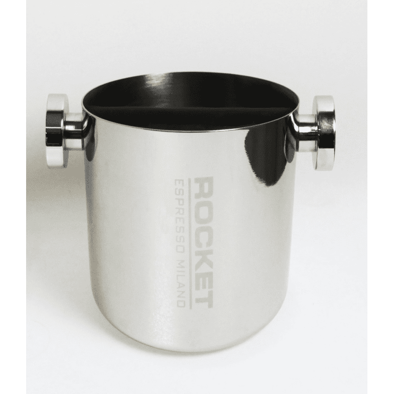 Recipient elegant pentru zațul de cafea de la ROCKET, din oțel inoxidabil cromat lustruit, cu logo-ul Rocket.
