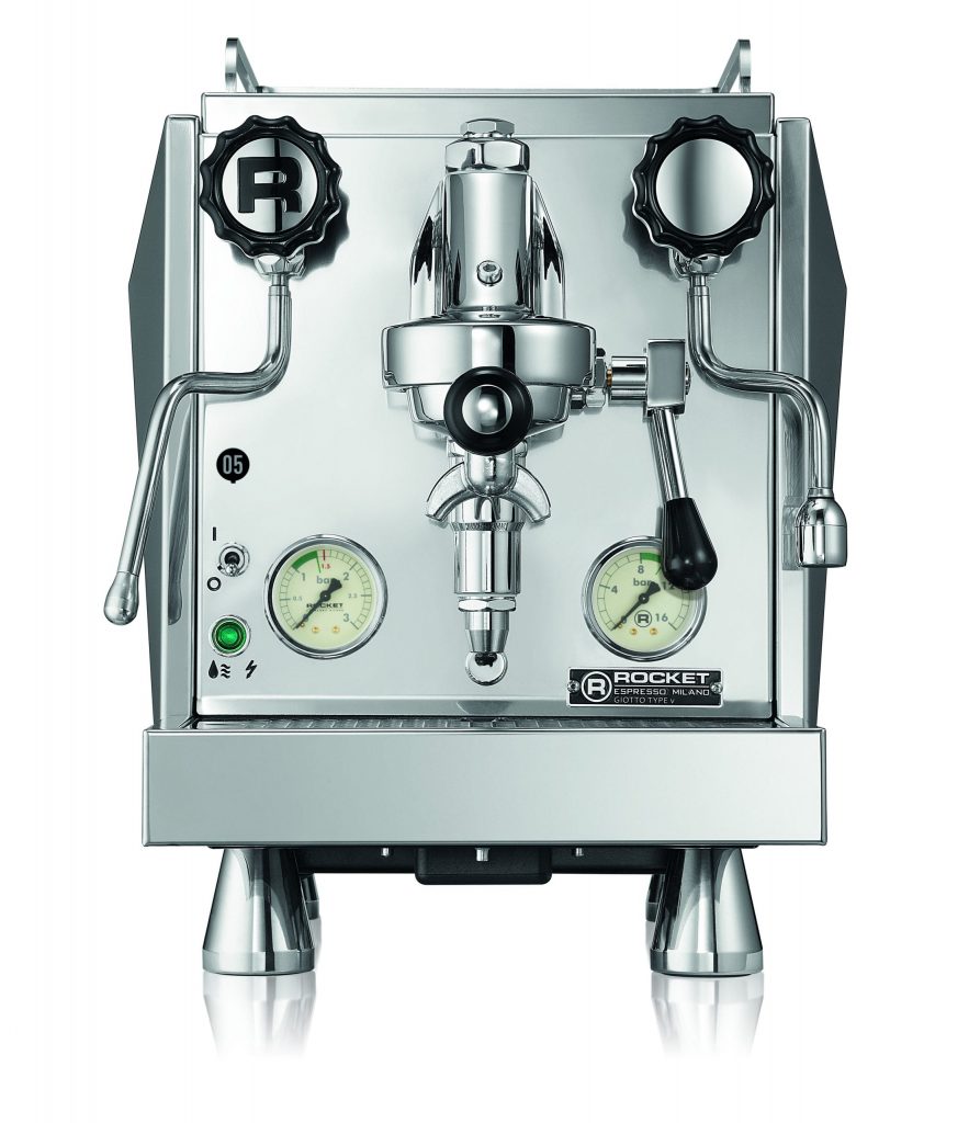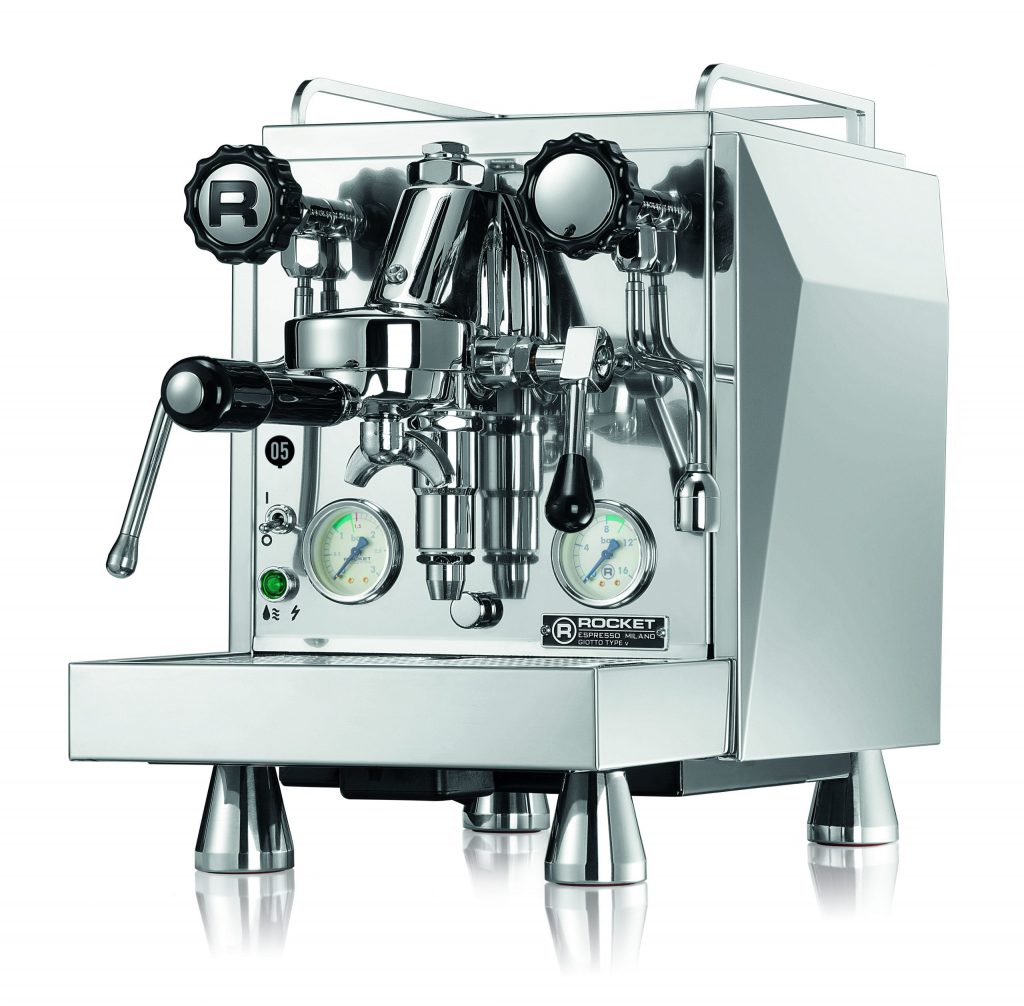Aparatul Giotto Cronometro V de la Rocket are o carcasă cu pereți groși din oțel cromat, cu laterale cubice și canturi rotunjite. Aparatul este stabil datorită celor patru picioare metalice și are un cadru din oțel inoxidabil pentru depozitarea sigură a ceștilor și a celorlalte accesorii. Butonul de comutare are un design retro atractiv conferind aparatului o notă aparte.